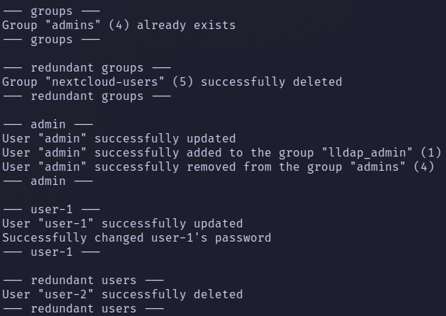 Then, to bootstrap your lldap just run docker compose exec lldap /bootstrap/bootstrap.sh. If config files were changed, re-run the bootstrap.sh with the same command.